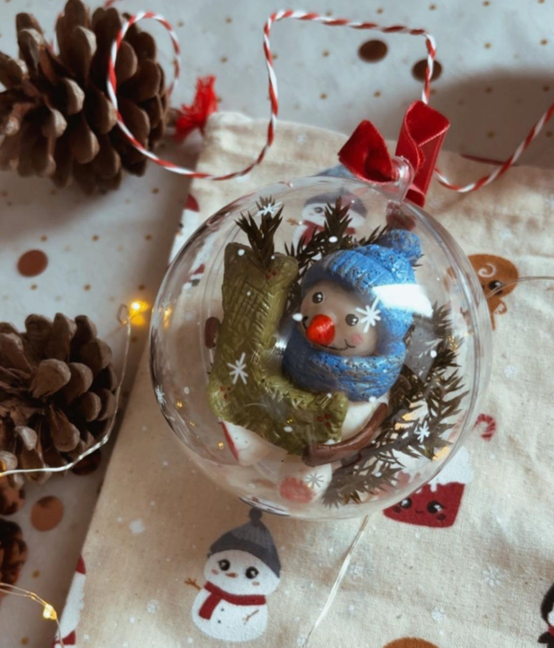 Bola de Navidad infantil personalizada para los más peques de la casa. El muñeco de nieve con la letra es de porcelana fría y está hecha a mano. Una pieza única y muy especial.